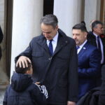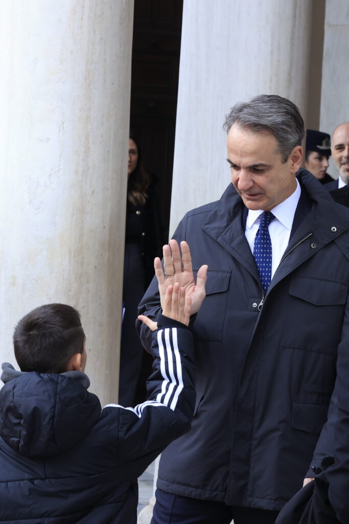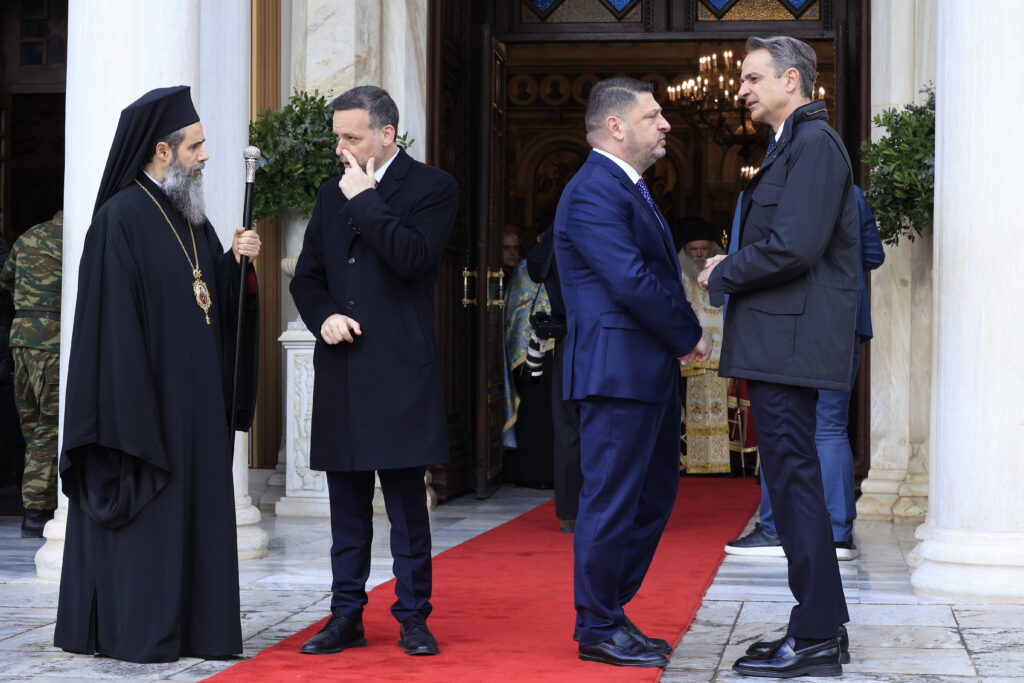 Λίγο πριν τις 10:00, στον ναό έφτασε ο πρωθυπουργός Κυριάκος Μητσοτάκης, ο οποίος είχε σύντομες συνομιλίες με πολίτες και αντάλλαξε ευχές για την εθνική επέτειο. Ωστόσο, ιδιαίτερο ενδιαφέρον παρουσίασαν τα λεγόμενα «πηγαδάκια» που σχηματίστηκαν στον προαύλιο χώρο αλλά και εντός του ναού, ανάμεσα σε πολιτικούς αρχηγούς και θεσμικούς παράγοντες.