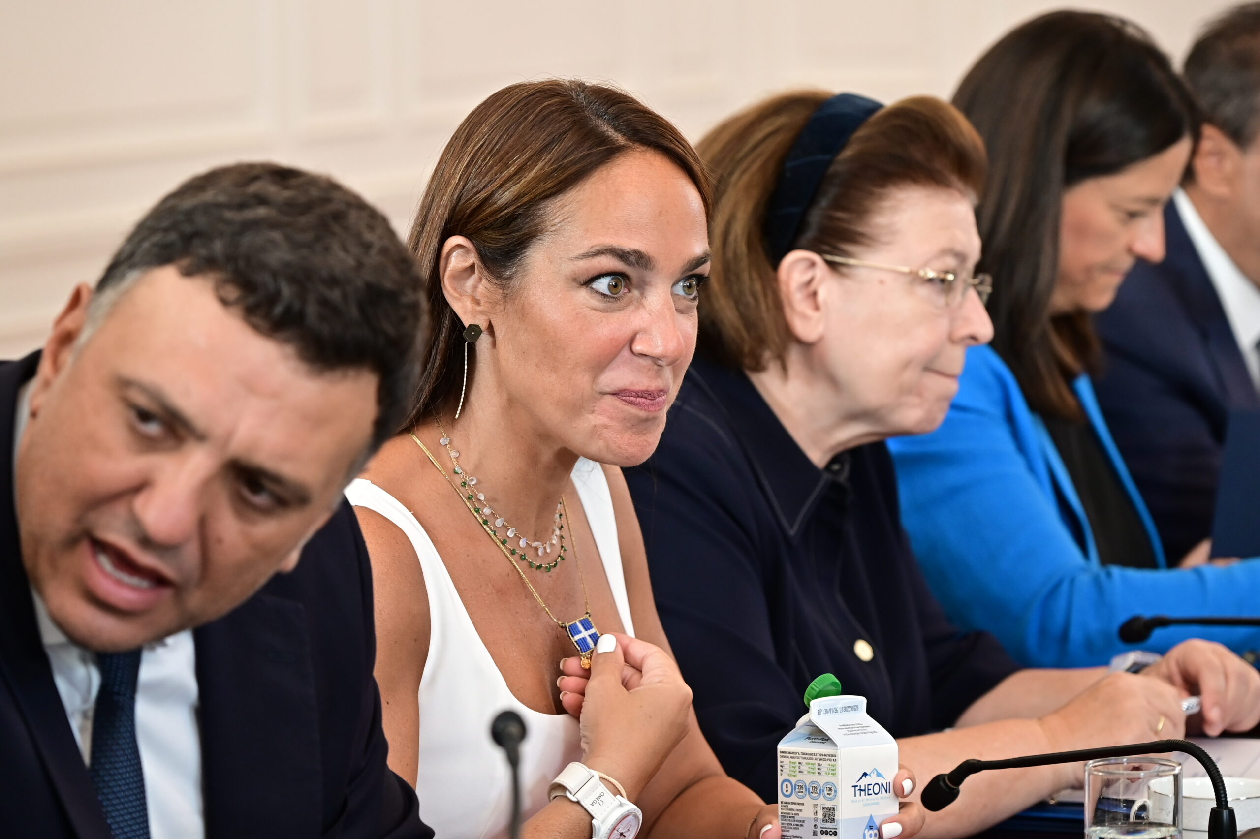 Τα γέλια, οι σύντομες προσωπικές κουβέντες αλλά και οι χαιρετισμοί μετά τις καλοκαιρινές αποδράσεις, έδιναν την αίσθηση μιας ομάδας που ξαναβρίσκεται έτοιμη να συντονιστεί. Μάλιστα, η Δόμνα Μιχαηλίδου τράβηξε τα βλέμματα, δείχνοντας στους συναδέλφους της ένα ιδιαίτερο κόσμημα που φορούσε στον λαιμό, διακοσμημένο με το ελληνικό εθνόσημο – μια συμβολική λεπτομέρεια που προκάλεσε τον θαυμασμό της κ. Μενδώνη που καθόταν δίπλα της.