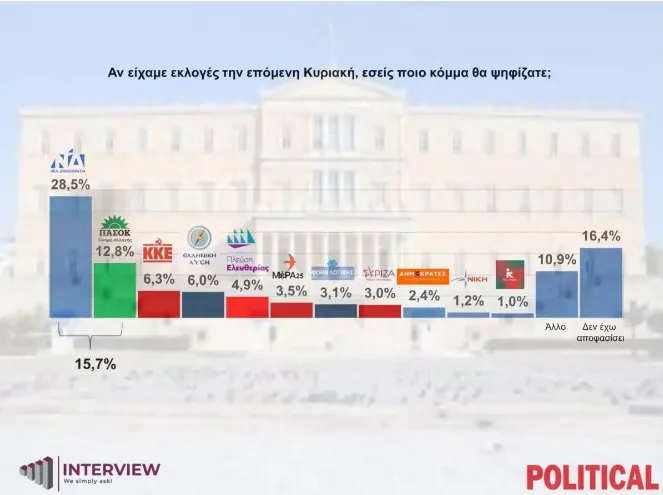 Άνοδο της Νέας Δημοκρατίας στην εκτίμηση ψήφου και άνοιγμα της ψαλίδας με το ΠΑΣΟΚ καταγράφει η νέα δημοσκόπηση της Interview για λογαριασμό της εφημερίδας Political. Το κυβερνών κόμμα εμφανίζεται να δρέπει τα οφέλη από την απόφαση αποστολής ναυτικών και αεροπορικών δυνάμεων για την ενίσχυση της κυπριακής αεράμυνας, καθώς η κίνηση είχε θετική αποδοχή από το 75% των ερωτηθέντων.