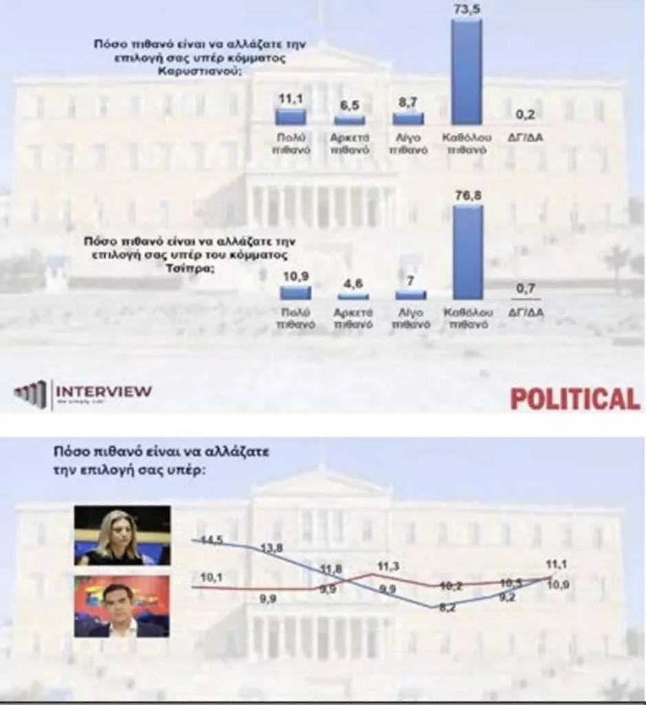 Στην ερώτηση «πόσο πιθανό είναι να αλλάζατε την επιλογή σας υπέρ κόμματος Καρυστιανού;», το 11,1% απαντά πολύ πιθανό, το 6,5% αρκετά πιθανό, το 8,7% λίγο πιθανό, το 73,5% καθόλου πιθανό και το 0,2% ΔΓ/ΔΑ.