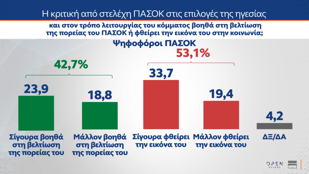 Το 53,1% των ψηφοφόρων θεωρεί ότι η κριτική στελεχών φθείρει την εικόνα του κόμματος, ενώ το 42,7% εκτιμά ότι βοηθά στη βελτίωση της πορείας του.