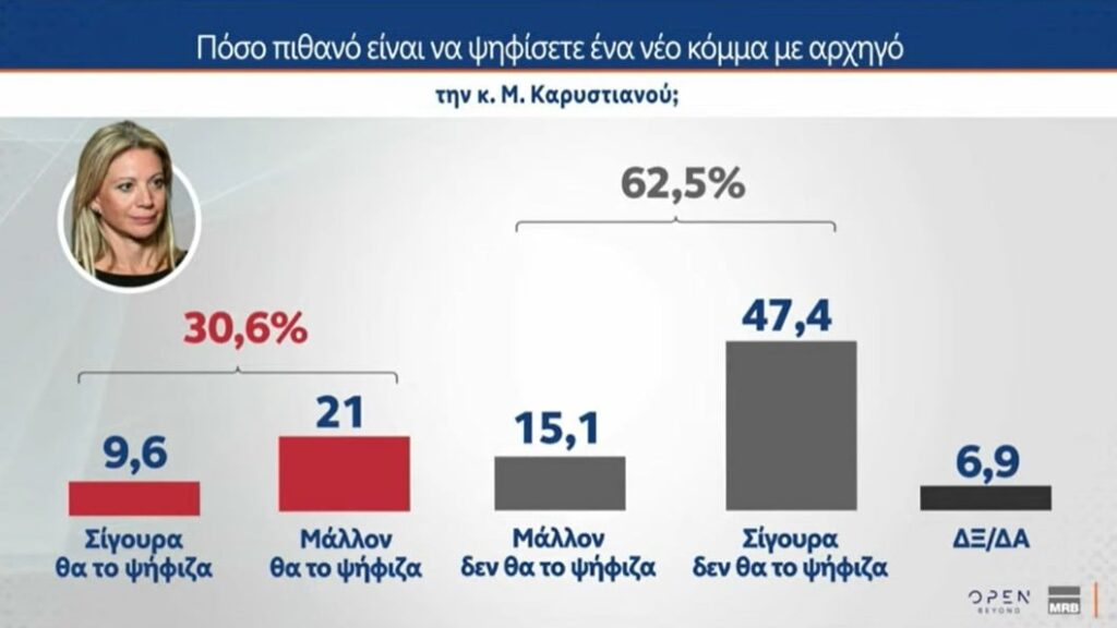 Στο ίδιο ερώτημα για την κα Μαρία Καρυστιανού, το 30,6% δηλώνει ότι «σίγουρα/μάλλον θα το ψήφιζα», ενώ το 62,5% απαντά «μάλλον/σίγουρα δεν θα το ψήφιζα».