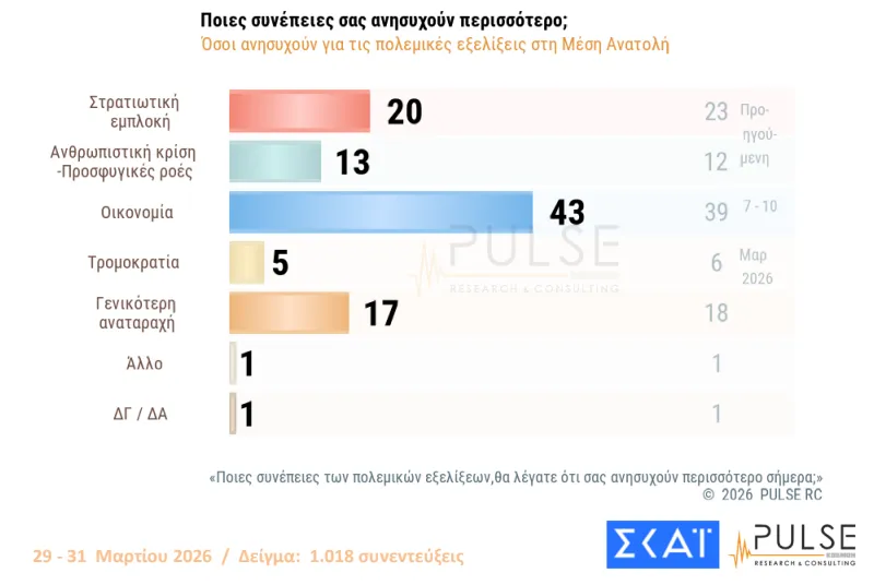 Τις συνέπειες της πολεμικής κρίσης στη Μέση Ανατολή και τα μέτρα ανακούφισης της κυβέρνησης αξιολογούν οι πολίτες στη δημοσκόπηση της Pulse που παρουσιάστηκε στο κεντρικό δελτίο ειδήσεων του ΣΚΑΪ. Η έρευνα διενεργήθηκε πριν από τις πρόσφατες εξελίξεις με τη νέα δικογραφία για τον ΟΠΕΚΕΠΕ, γεγονός που σημαίνει ότι δεν έχει καταγραφεί ο αντίκτυπος.