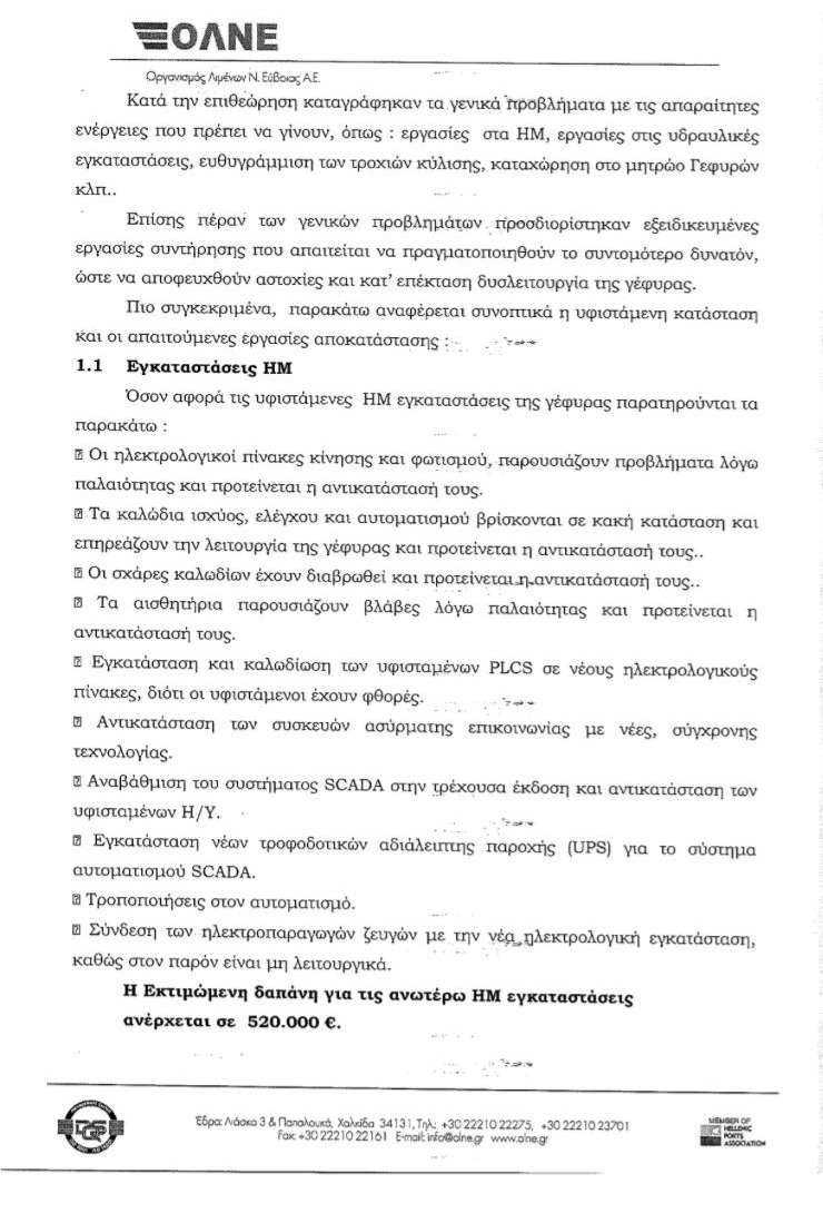 Το κόμμα δίνει στη δημοσιότητα επιστολή του Οργανισμού Λιμένος Νομού Ευβοίας, με ημερομηνία 4 Φεβρουαρίου 2025, στην οποία αναφέρεται ότι η γέφυρα παρουσιάζει συχνά προβλήματα λόγω της παλαιότητάς της και γίνεται αναφορά σε μελέτη του ΕΜΠ, από την οποία προέκυψε ότι απαιτούνται επεμβάσεις, κυρίως όσον αφορά στη στατικότητά της. Στην επιστολή αναφέρονται αναλυτικά οι απαιτούμενες εργασίες αποκατάστασης της γέφυρας, όπως προέκυψαν από επιθεώρηση των υπηρεσιών του ΟΛΝΕ.