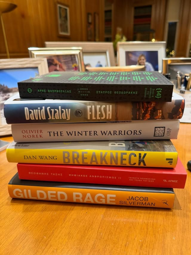 Στην κορυφή της στοίβας βρίσκεται το νέο συγγραφικό πόνημα του Σταύρου Θεοδωράκη, το οποίο συνυπογράφει με τον καθηγητή Άρη Βουρβούλια.