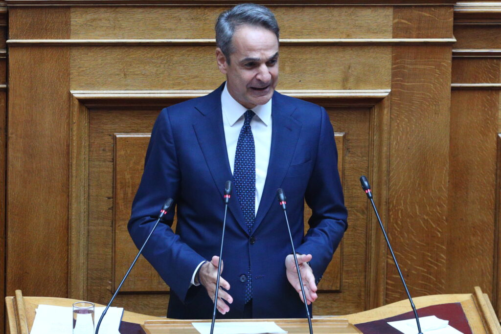 Ο πρωθυπουργός Κυριάκος Μητσοτάκης μιλάει στη Βουλή, στη συζήτηση με αντικείμενο την ενημέρωση του σώματος για ζητήματα εξωτερικής πολιτικής, η οποία προγραμματίστηκε κατόπιν αιτήματός του, σύμφωνα με το άρθρο 142Α του κανονισμού της Βουλής.