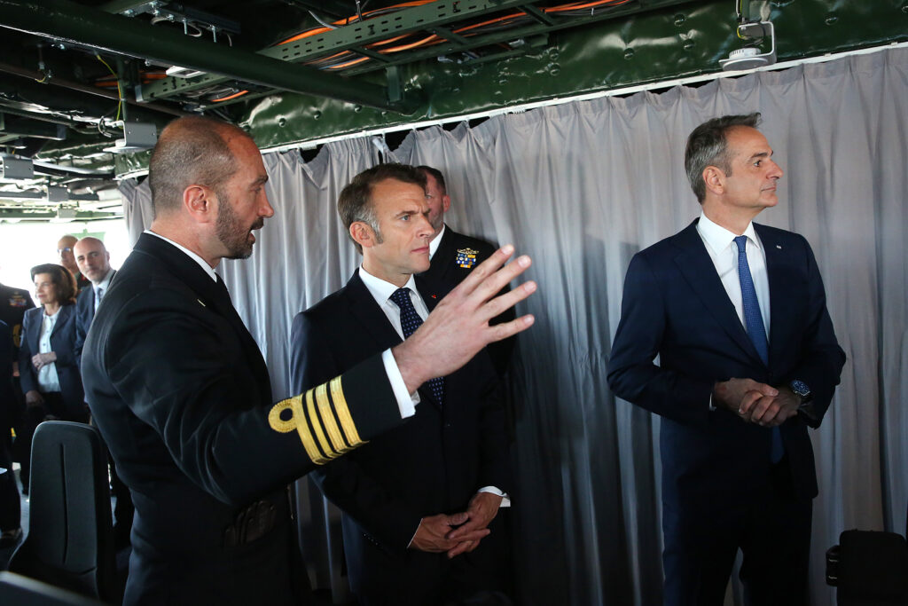 O Πρόεδρος της Γαλλίας Emmanuel Macron (Εμανουέλ Μακρόν) (Κ) και ο πρωθυπουργός Κυριάκος Μητσοτάκης (ΚΑ), περιηγούνται στη φρεγάτα του Πολεμικού Ναυτικού «Κίμων», στο λιμάνι του Πειραιά ΑΠΕ-ΜΠΕ/ΑΠΕ-ΜΠΕ/ΟΡΕΣΤΗΣ ΠΑΝΑΓΙΩΤΟΥ