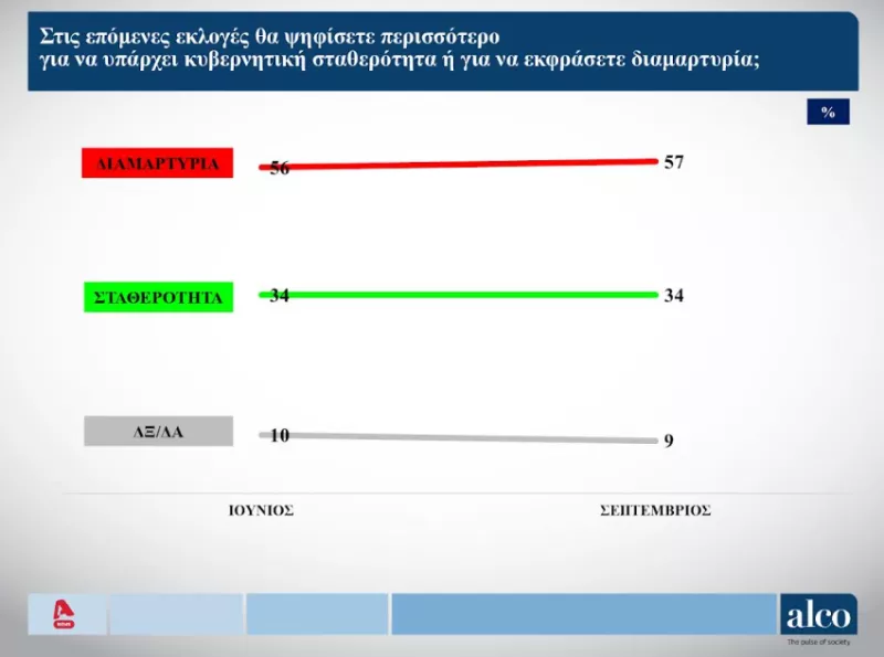 Εξαιρετικό ενδιαφέρον παρουσιάζουν οι απαντήσεις σε δύο ερωτήματα, τα οποία αφορούν στις επόμενες εκλογές. Πρώτον, οι έξι στους δέκα δεν εκφράζονται από κανένα κόμμα, ενώ σχεδόν έξι στους δέκα (57%) θα ψηφίσουν στις εκλογές για διαμαρτυρία και όχι για σταθερότητα.