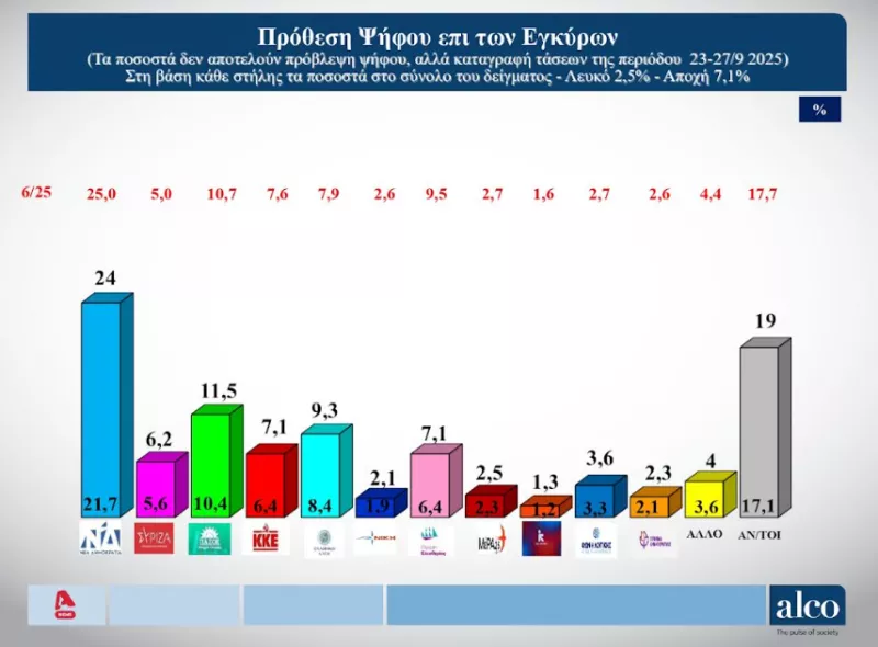 Σύμφωνα με τα στοιχεία της έρευνας, η ΝΔ συγκεντρώνει το 24% στην πρόθεση ψήφου, έναντι 11,5% που συγκεντρώνει το ΠΑΣΟΚ. Τρίτο κόμμα αναδεικνύεται η Ελληνική Λύση με 9,1%, ενώ την τέταρτη θέση μοιράζονται Πλεύση Ελευθερίας και ΚΚΕ, με ποσοστό 7,1%. Ακολουθεί ο ΣΥΡΙΖΑ με 6,2% και η Φωνή Λογικής με 3,6%.