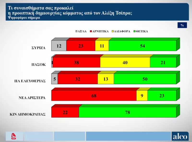 Ενδιαφέρον επίσης, έχουν οι απαντήσεις των πολιτών που ψηφίζουν τον ΣΥΡΙΖΑ τα κόμματα που προήλθαν από το κόμμα της Κουμουνδούρου. Το 54% των ψηφοφόρων του ΣΥΡΙΖΑ βλέπουν θετικά μία κίνηση από τον Αλέξη Τσίπρα. Αντίστοιχα, το 78% των ψηφοφόρων του Κινήματος Δημοκρατίας είναι θετικοί, όπως και το 50% της Πλεύσης Ελευθερίας. Πιο χαμηλά είναι τα ποσοστά στη Νέα Αριστερά (23%) και στο ΠΑΣΟΚ (21%), το οποίο έχει τη σημασία του, καθώς το ΠΑΣΟΚ είναι αξιωματική αντιπολίτευση και δεν είναι… παράγωγο του ΣΥΡΙΖΑ.