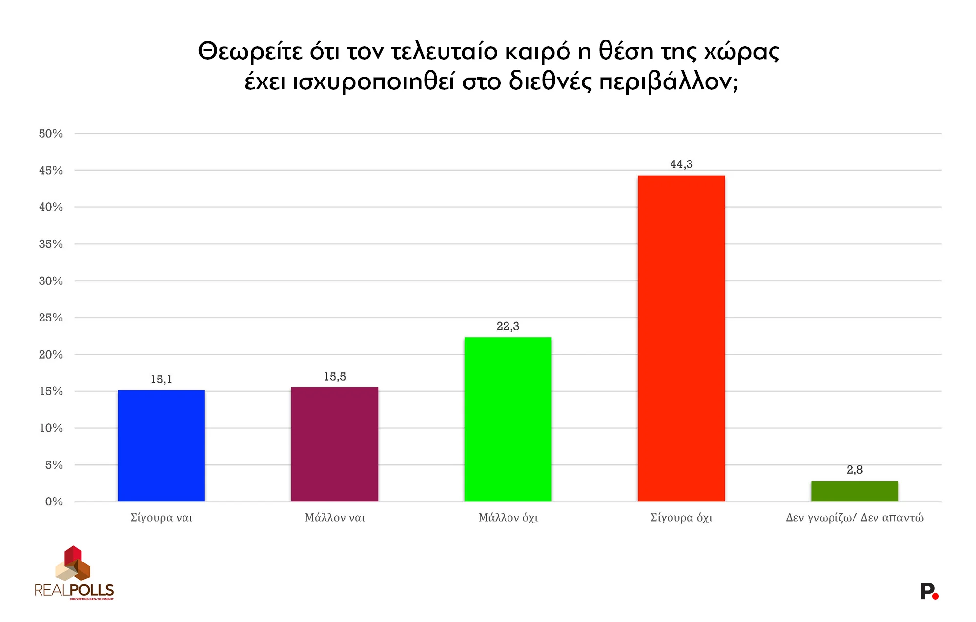 Την ίδια στιγμή, ένα ποσοστό που υπερβαίνει το 66% απαντά αρνητικά στο ερώτημα «θεωρείτε ότι τον τελευταίο καιρό η θέση της χώρας έχει ισχυροποιηθεί στο διεθνές περιβάλλον;» (Πίνακας VI).