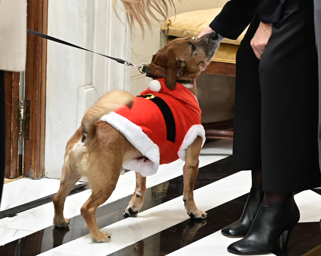Ο Πρωθυπουργός Κυριάκος Μητσοτάκης, άκουσε τα κάλαντα των Χριστουγέννων στο Μέγαρο Μαξίμου από το Μουσικό Σχολείο Αλίμου και από τον Πολιτιστικό Σύλλογο Ερέτριας «Κωνσταντίνος Κανάρης». Ωστόσο αυτός που έκλεψε την παράσταση για άλλη μια χρονιά, ήταν ο σκύλος του Μεγάρου Μαξίμου, Πίνατ, ο οποίος μάλιστα ήταν ντυμένος Άγιος Βασίλης.