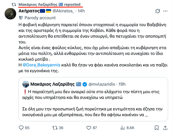 Λίγες ώρες μετά την παραίτησή του, ο Μακάριος Λαζαρίδης αναδημοσίευσε στον λογαριασμό του στο “X” την «ανάλυση» ενός εκ των ψευδώνυμων διαδικτυακών Αντισύριζα fighters, ο οποίος αποκαλεί «φοβική» την κυβέρνηση, επειδή ενέδωσε στις πιέσεις για την αποπομπή του βουλευτή Καβάλας από τις τάξεις της.