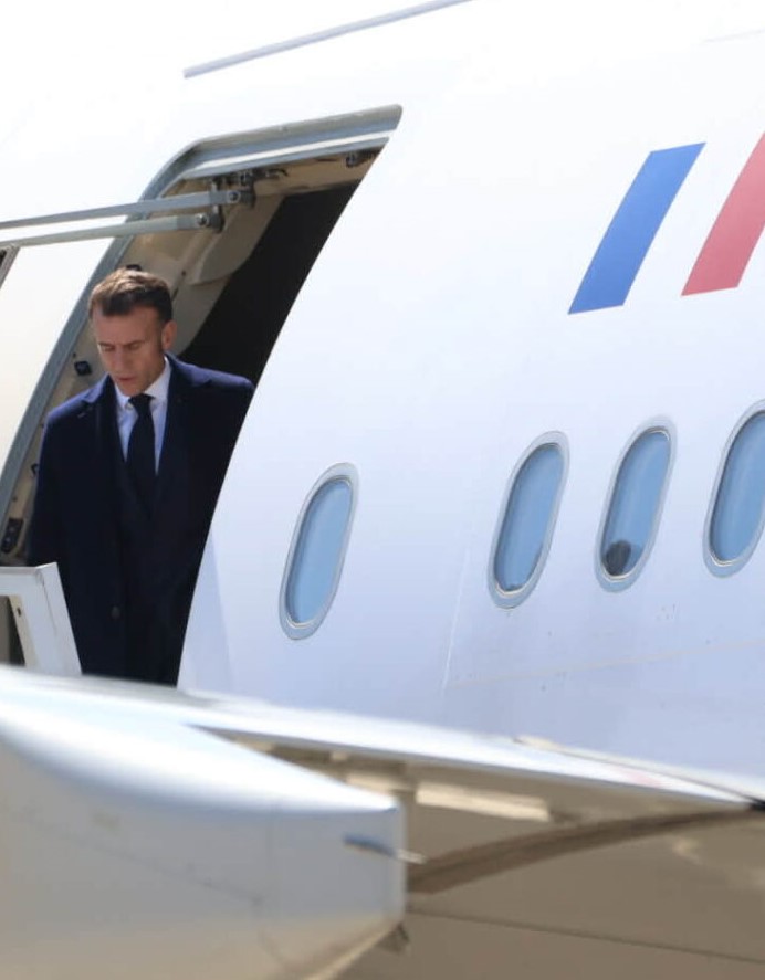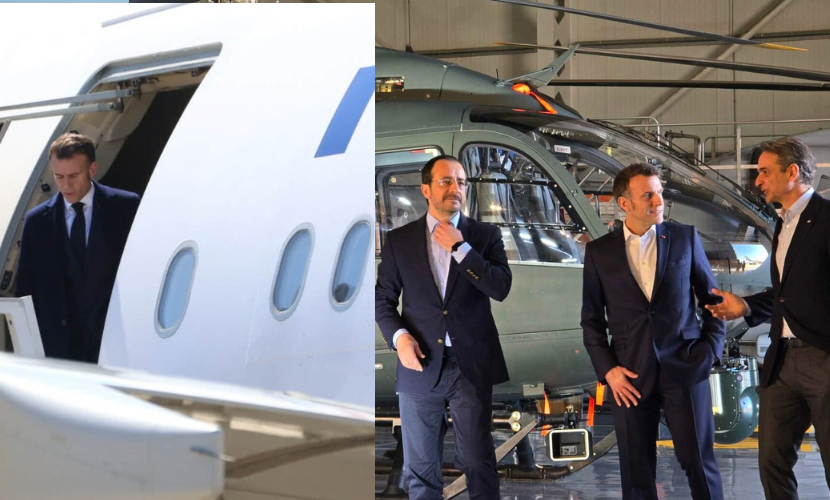 Ο Γάλλος πρόεδρος την ώρα που προσγειώθηκε με το προεδρικό αεροσκάφος, εμφανίστηκε να κατεβαίνει στην πίστα του αεροδρομίου φορώντας γραβάτα χαιρετίζοντας Μητσοτάκη και Χριστοδουλίδη, όπως φαίνεται και στις φωτογραφίες.