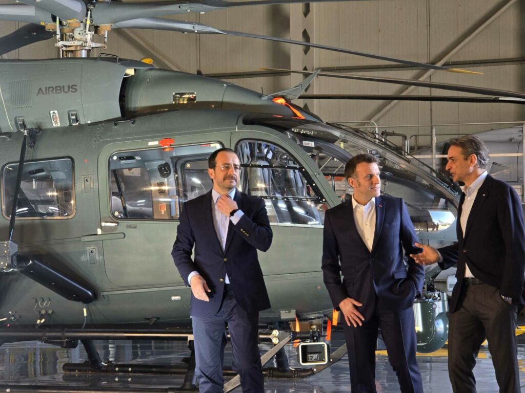 Ακολούθησε η τριμερής συνάντηση των τριών ηγετών και οι δηλώσεις τους, με τον Εμανουέλ Μακρόν, να εμφανίζεται χωρίς γραβάτα, όπως ο Έλληνας πρωθυπουργός και ο Κύπριος πρόεδρος.