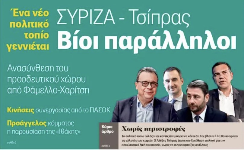 Στο επίμαχο πρωτοσέλιδο με τίτλο «ΣΥΡΙΖΑ – Τσίπρας, βίοι παράλληλοι», η εφημερίδα παρουσίαζε τον πρώην πρωθυπουργό σε αντιπαραθετικό κάδρο με τον ΣΥΡΙΖΑ, κάνοντας λόγο για «ανασύνθεση του προοδευτικού χώρου από Φάμελλο – Χαρίτση» και «κινήσεις συνεργασίας από το ΠΑΣΟΚ».